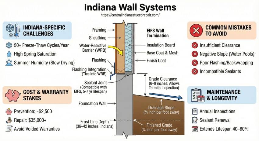Indiana’s climate presents specific challenges for EIFS grade termination design. Freeze-thaw cycles, heavy rainfall, and temperature variations all affect termination performance.